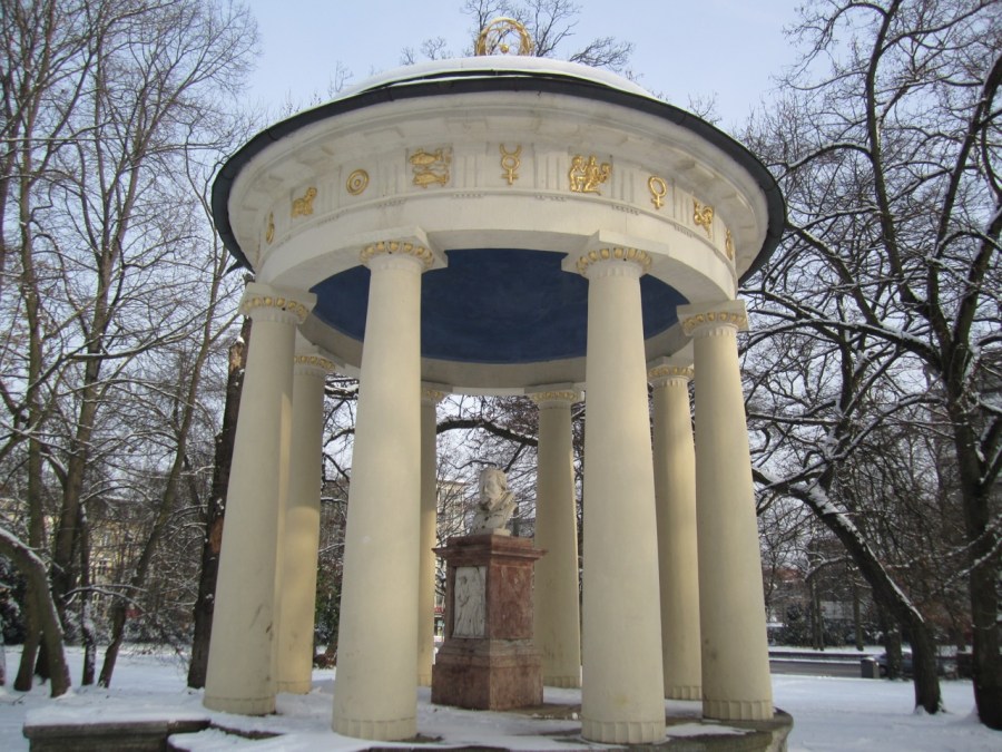 I find the astrological symbols ringing the monument rather amusing, to say the least. It looks so stark in winter… summer foliage would give it the look of something from a video game, almost, I think. But winter makes it look right. Out of place and too fine for the hard edges around it.