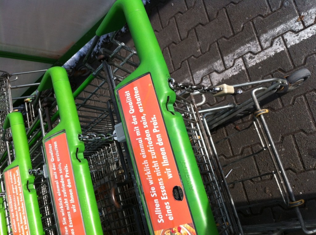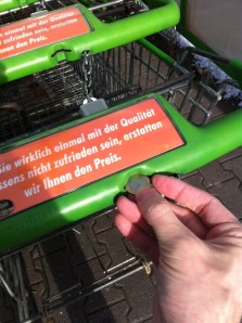 There’s much more to them than I realized at first, though. Since I wasn’t planning on using them, I didn’t look very closely. I did notice that there was never a stray cart in a random place in the parking lot though, and now I know why: They’re chained together. In order to release a cart, you have to either use a one Euro coin or a plastic disk that you’ve paid for. This is a pretty ingenious way to make sure that carts find their way back to the right place.