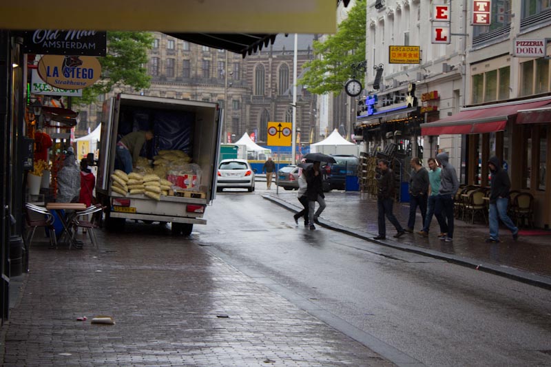 One of the most common snack foods in Amsterdam is fresh french fries with a wide variety of interesting sauces.  Frankly, it reminded me of Thrasher’s French Fries in Ocean City, Maryland.  In the morning, it was not uncommon to see a delivery truck bringing bags upon bags of whole potatoes to be used in the french fries.  This picture was taken on the Damstraat in the morning, around breakfast time.  The truck is parked in front of a french fry shop.