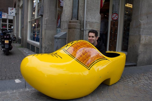 This first picture was taken in front of a store on Damrak, the big street that spins out in front of the Centraal train station.   The street is very touristy-  lots of tour offices, a slew of restaurants including a McDonald’s and a KFC.  This is the street where one of the two sex museums in Amsterdam resides. (For the record, I found the sex museum to be pretty tame, but I’m a hard man to shock.)  In any case, the wooden clogs are a traditional thing for the Netherlands, so they’re everywhere.  The tour we took even had a ‘Tip Clog.’  Seeing this rack of wooden shoes in a touristy shop was like a big warm “welcome to Amsterdam” sign.
