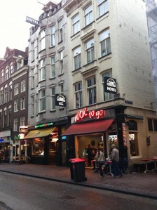 This was our hotel on the Damstraat.  The bottom level of the hotel was a pizza joint and a wok restaurant.  This entire street was at least sixty or seventy percent restaurants, since it was adjacent to Dam square and was convenient to all the tram lines.  I would stay there again, if I visited, because the location is incredibly good for a tourist- right in the middle of everything.