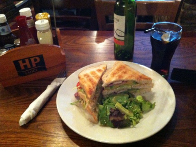 If you’re ever near Tower Station in London, seek out the Minories Pub. I highly recommend their food and service. This is a chicken, bacon, and avocado club sandwich. It was very tasty.