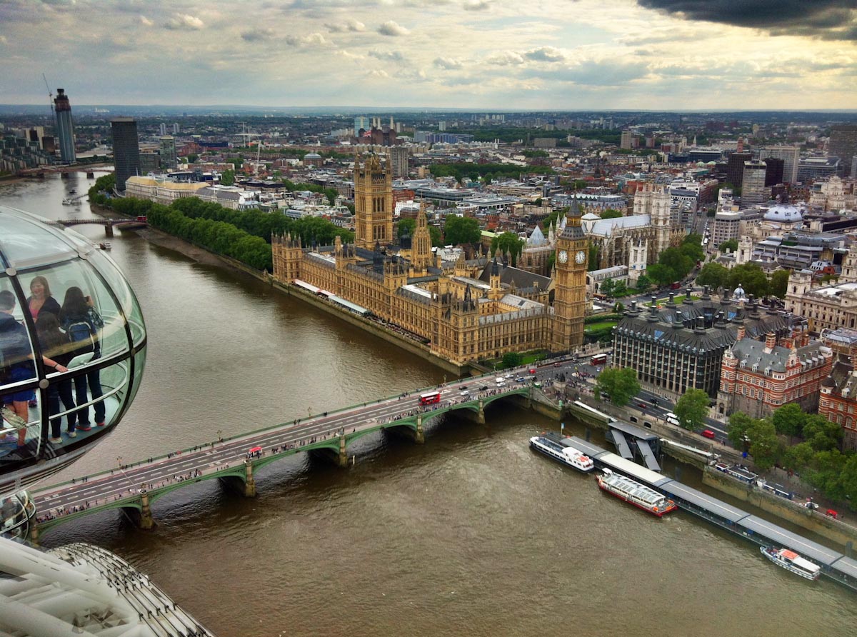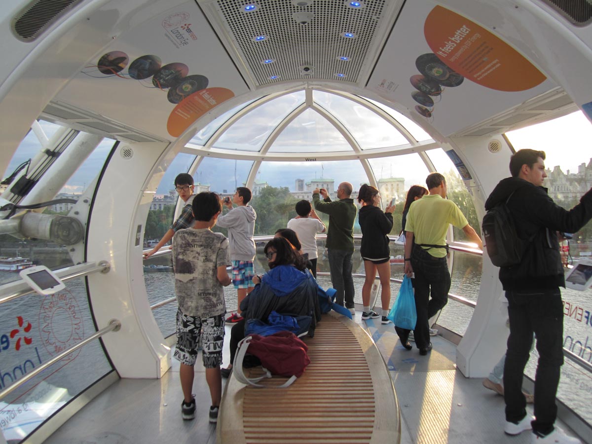 I don’t really know why I love the idea of this thing so much, but one of the things at the top of my “I MUST DO THIS” list was to ride the London Eye. When the Eye went up in 1999, it was often referred to as “the London Eyesore,” but people have warmed to it since then and it’s become a much loved part of the London skyline. The Eye is basically a giant Ferris wheel, except that each of the cars is an oval shaped, sealed, and air conditioned compartment big enough for about 25 people to move around. The compartments are rotated throughout the ride so that the compartment is always completely vertical, and a ride around the entire circumference takes about thirty minutes. During the ascent, you get a pretty spectacular view of Big Ben, the houses of Parliament, and Westminster Bridge just across the River Thames, and once you reach the top, you have an amazing panoramic view of London.