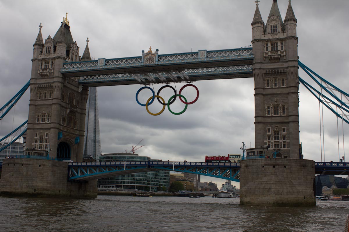 The London Bridge has a set of gigantic Olympic rings hanging from the upper level. I wish I’d posted this before the Olympics started, since I took these pictures beforehand. Now, of course, this picture has been done by every news agency in the world. It’s interesting to me that the rings fold up when the bridge has to open. I actually got to see this happen, as they opened the bridge for a passing boat while I was visiting the nearby Tower of London.