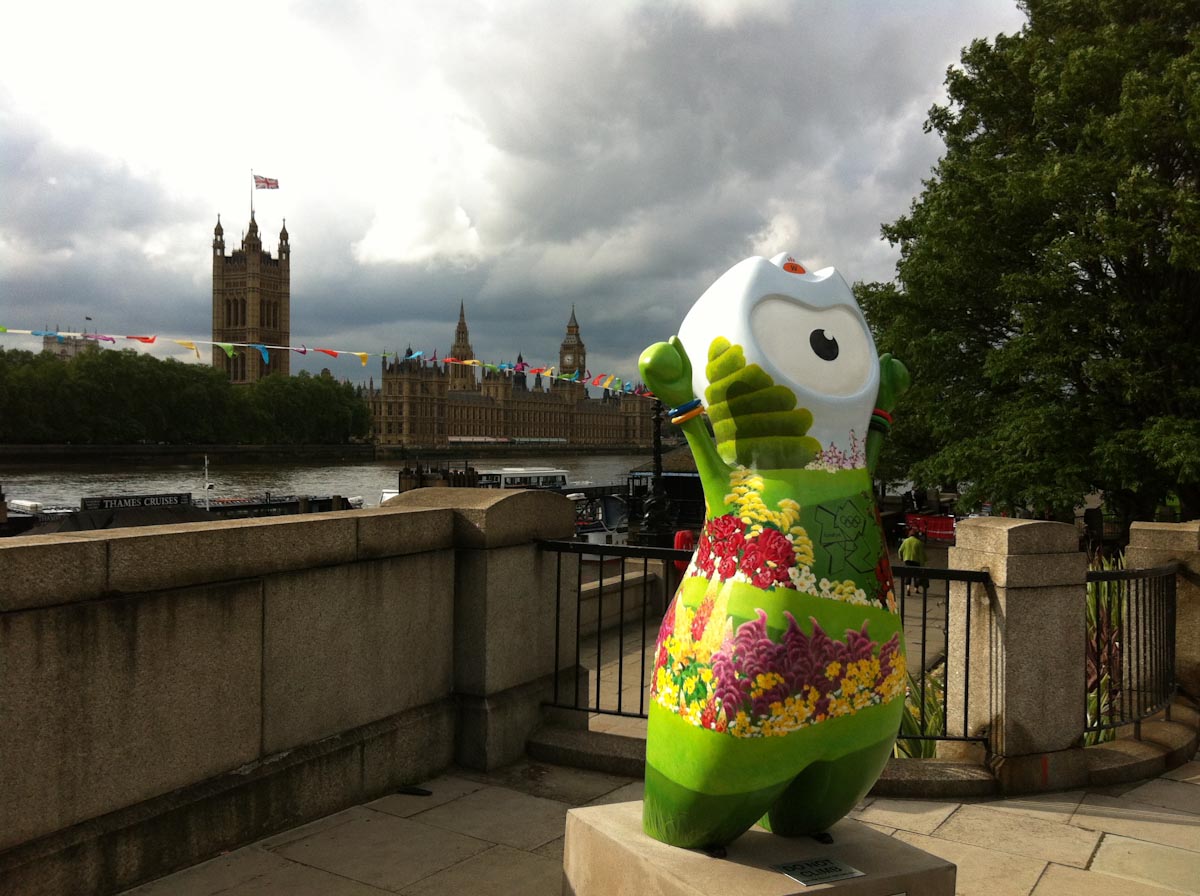 Wenlock and Mandeville, the Olympic and Paralympic mascots, are all over the city now, expecially along the Thames. I saw and photographed at least a dozen different variants, with different “outfits” painted on. This one is at one end of the Lambeth bridge, with his back toward Parliament.
