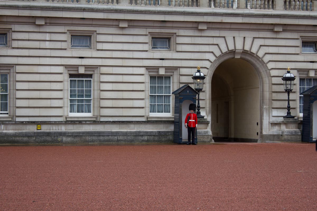 Another stop that was almost required viewing for a first time visit to London is the Changing Of The Guard ceremony at Buckingham Palace. Or, as I like to refer to it, the daily viewing of the umbrellas in the near constant rain. I did get a few pictures of the guards doing their thing, however. I read somewhere that there are four guards when the Queen is in residence, and two when she isn’t, so I could see that she was out that day. Here’s one of the two guards who was on duty.