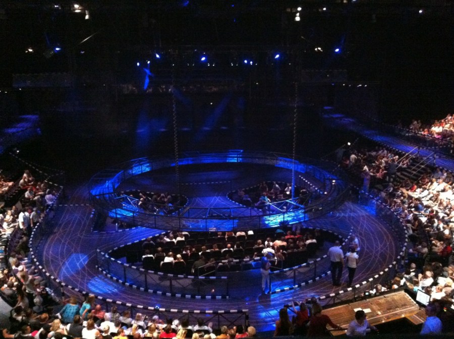 The staging is almost a separate character. There are U shaped tracks on several levels. There are set pieces that raise and tilt, and bridges that rotate almost 180 degrees to fill different needs. The characters can do tricks and stunts on certain sections of the stage. There are three seating sections where the action happens around you. You can see them clearly in the picture below, from before the show started.
