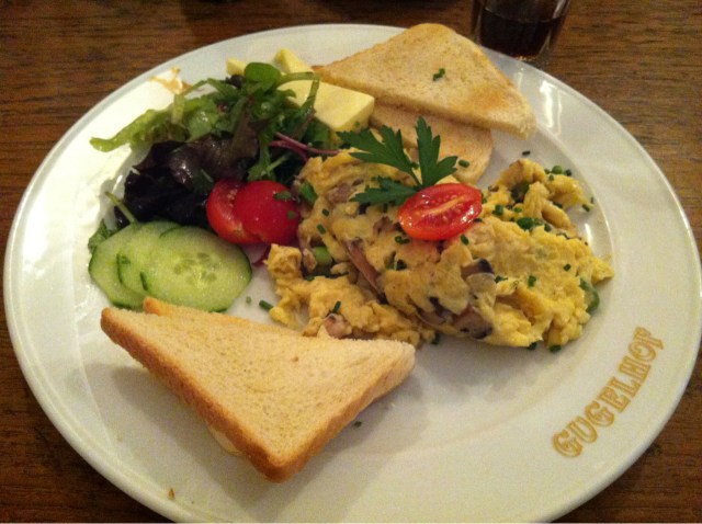 Scrambled eggs with herbs, mushrooms, and toast. Delicious late breakfast at Gugelhof in Berlin.