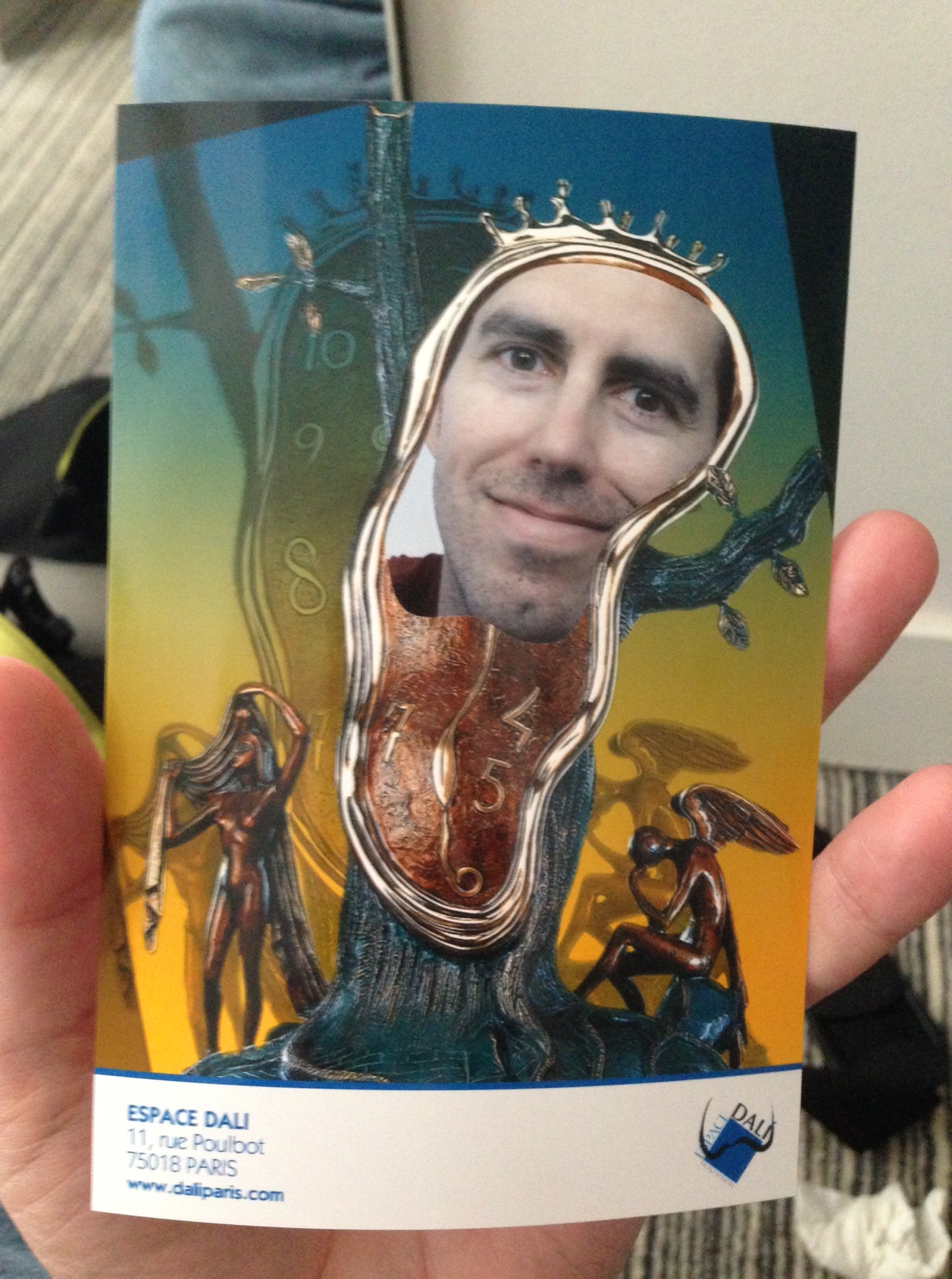 The Espace Dali had a photo booth that would superimpose your picture into Dali imagery. I got this one. If I’d had another €3 in coins, I would also have gotten the one that puts Salvador’s mustache on you.