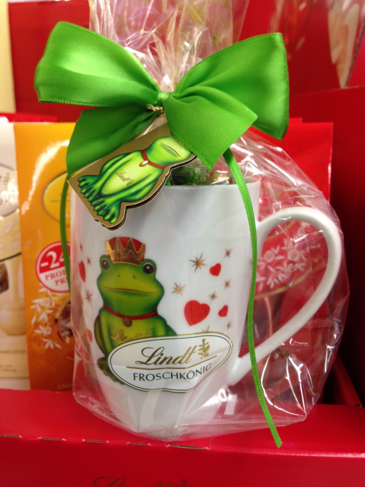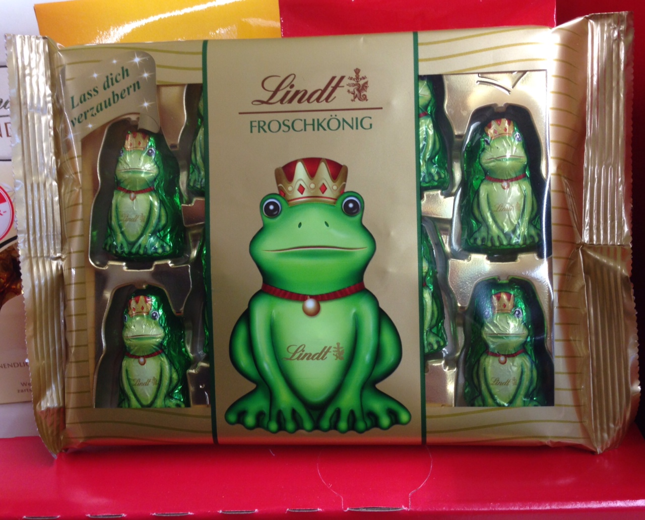 That being said, Germany does have its share of interesting traditions that aren’t generally found in the US. Among the red hearts full of chocolate and candy are the green foil wrappings of Lindt’s Der Froschkönig, the Frog King. The connection of the Frog King to Valentine’s Day seems to be based loosely on the Brothers Grimm faery tale of the Frog Prince. Eating a chocolate frog is better than kissing frogs, I guess. In the original Brothers Grimm version, the frog’s spell was broken when the princess threw it against a wall though. Maybe you’re supposed to throw your chocolate frog at the wall also.