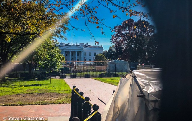 At one point, I put my phone camera right up to the opening in the chain-link fence that runs along H Street. This is as close as you can get to the People’s House right now, and this is two full blocks away as seen through a zoom lens. Pennsylvania Avenue has been closed off since the protests last summer, and Lafayette Square remains fenced off so nobody can come in.