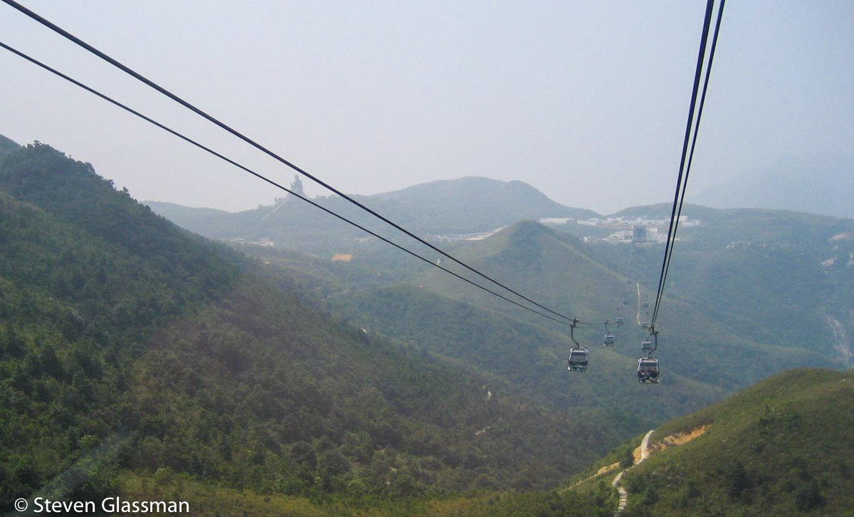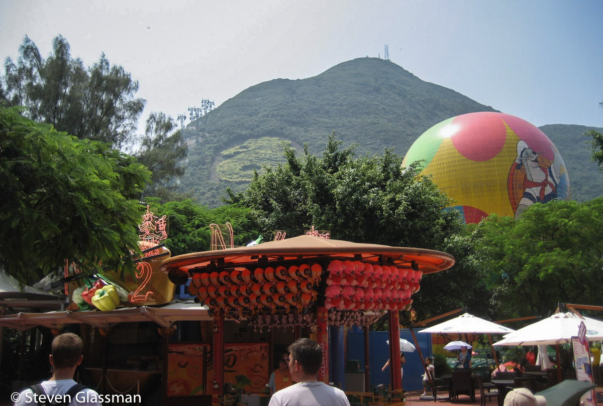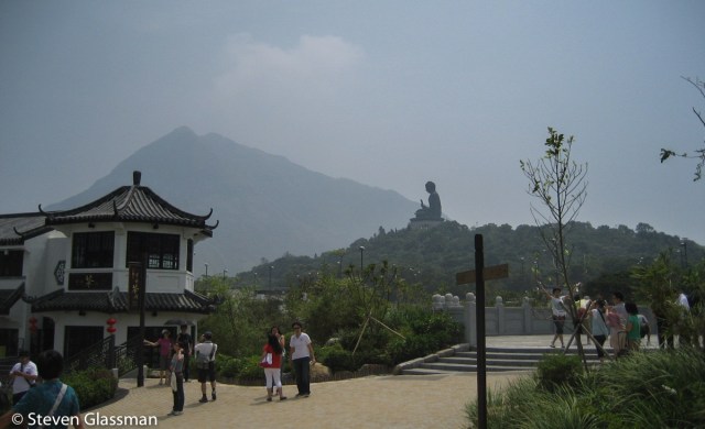 The cable car deposits you at Ngong Ping Village, a short walk from the Big Buddha. Lantau Peak (Fung Wong Shan,) the second highest peak in Hong Kong, is visible behind the Buddha.