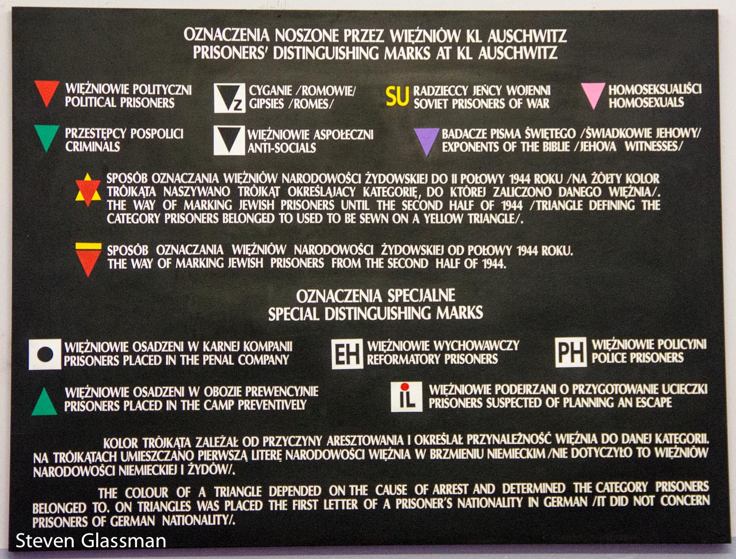 The Jewish star and the pink triangle are well known, but there were actually quite a few markers to designate why someone was in Auschwitz.