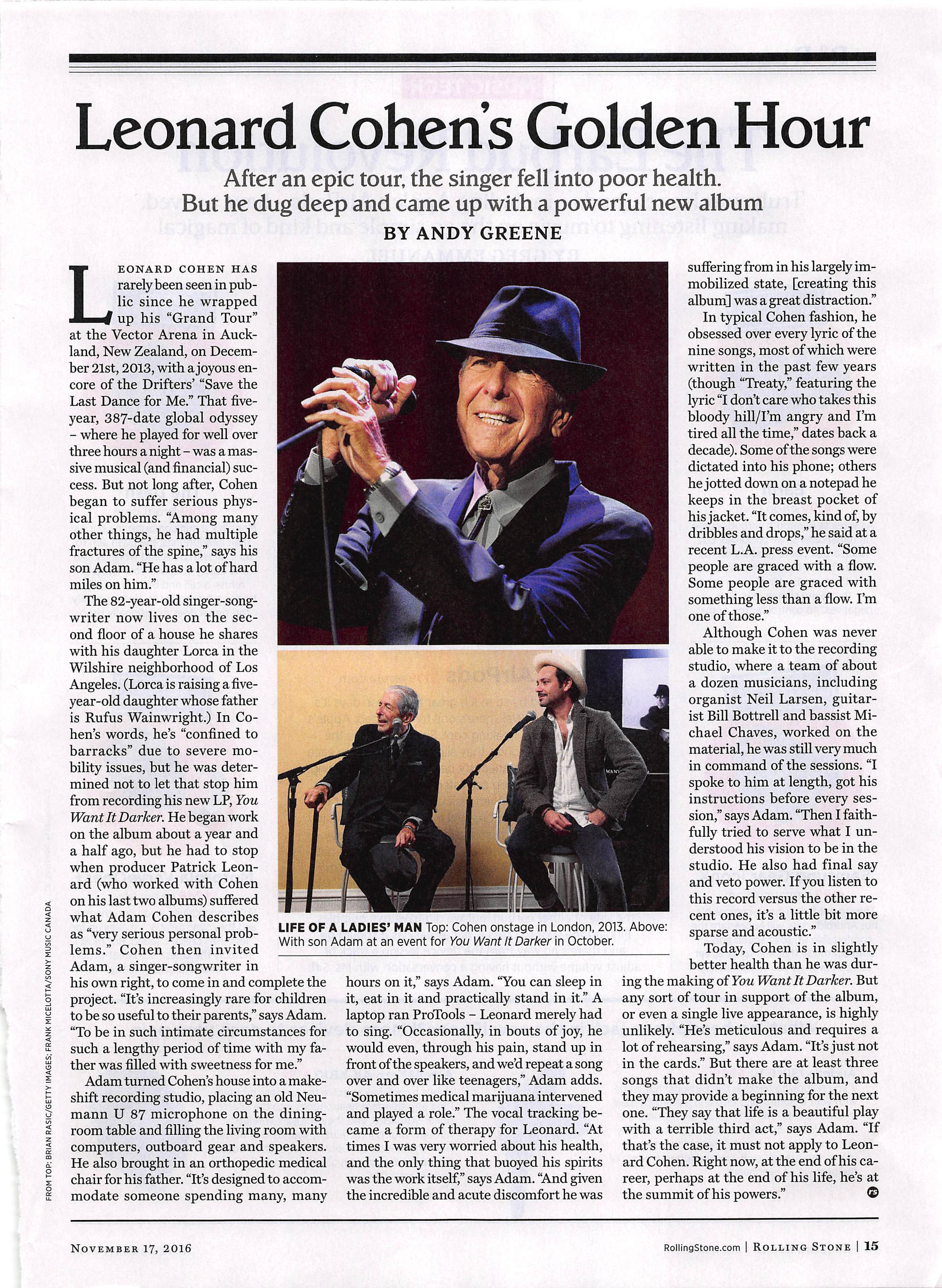 (Editor’s note: I accidentally acquired a subscription to the Rolling Stone a few months ago. I’m still not entirely sure how this happened, but every once in a while the magazine is really entertaining. If you’re interested in reading this fascinating look at the production of Leonard Cohen’s final album, I scanned the page from the November 17, 2016 Rolling Stone. Here you go. Click the thumbnail on the right to embiggen. )