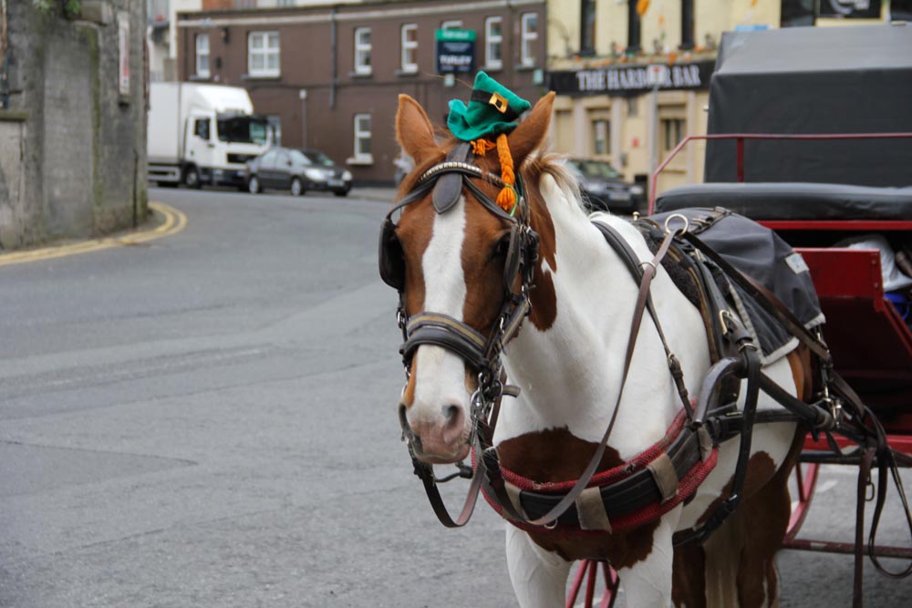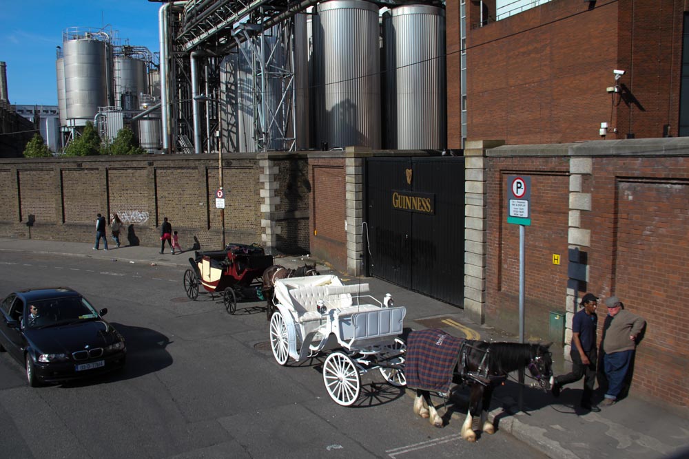 Outside of the Guinness Storehouse, the horses that pull the carriages are forced to suffer the indignity of tiny hats. They manage, though.