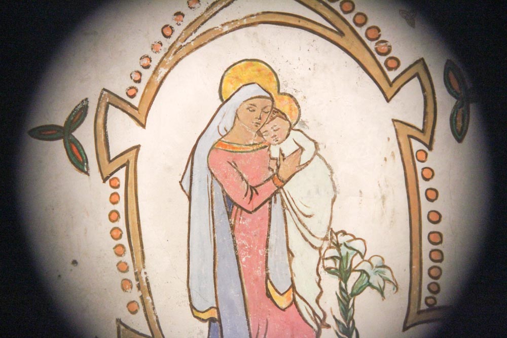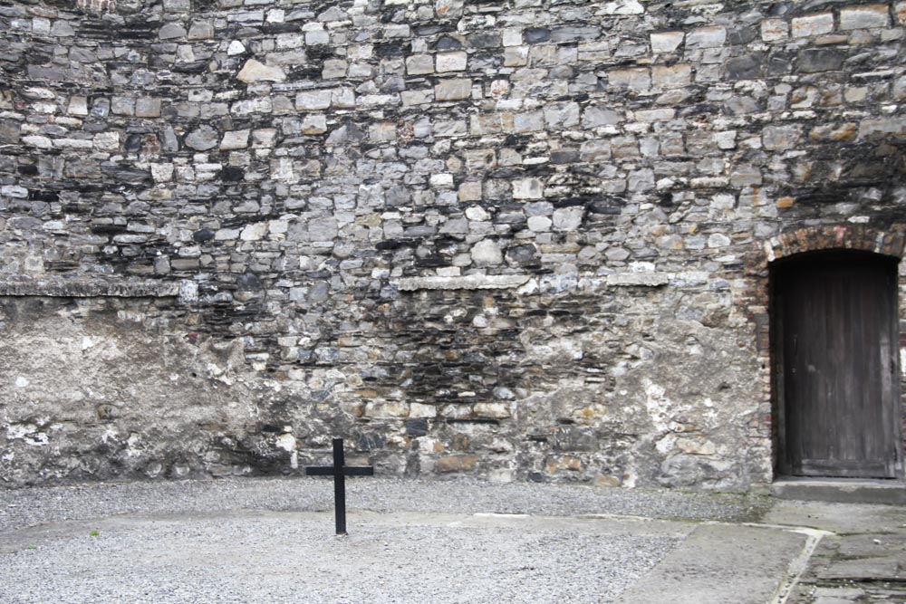 This is the interior cell wall of the jail cell occupied by Grace Gifford Plunkett. She marreid Joseph Plunkett hours before his execution for the uprising in 1916, and was later jailed for her activities with the IRA in 1923. She spent three months in Kilmainham Gaol, and she painted pictures on the walls of her cell, including the Virgin Mary and Christ as seen here through the cell door’s round peep-hole.
