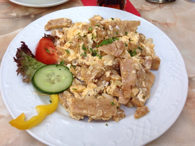 Roasted Knödel with egg at Cafe-Restaurant Gutenberg near Stephansplatz in Vienna.