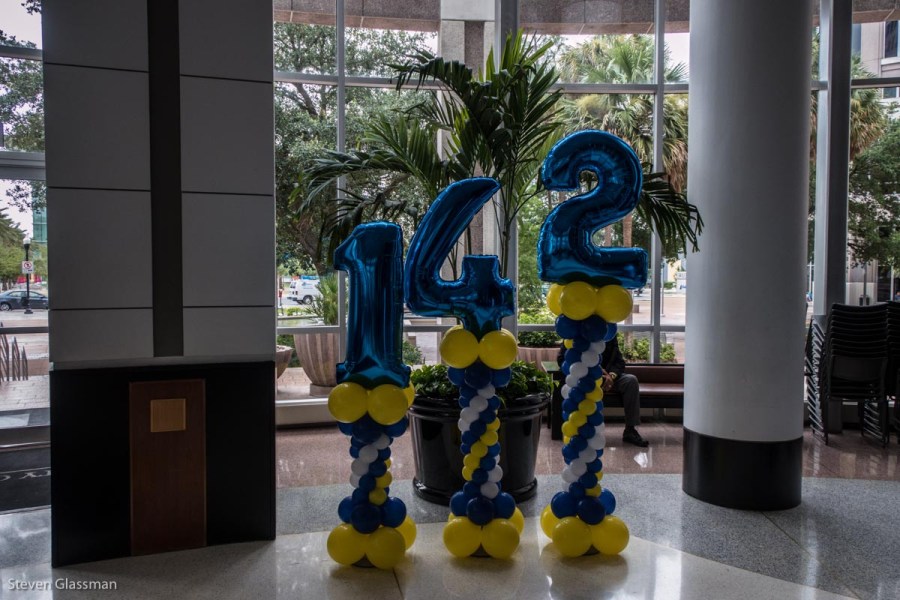 I arrived at City Hall about fifteen minutes before the celebration was scheduled to start, so I could get the lay of the land. I’d never actually been inside the building before, but it was easy to find the door because the giant inflatable 142 was visible from outside.