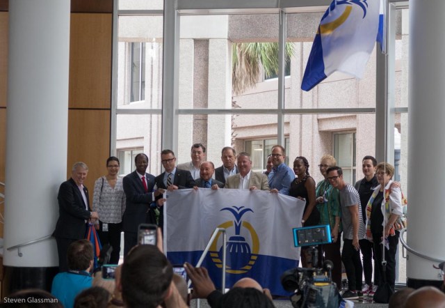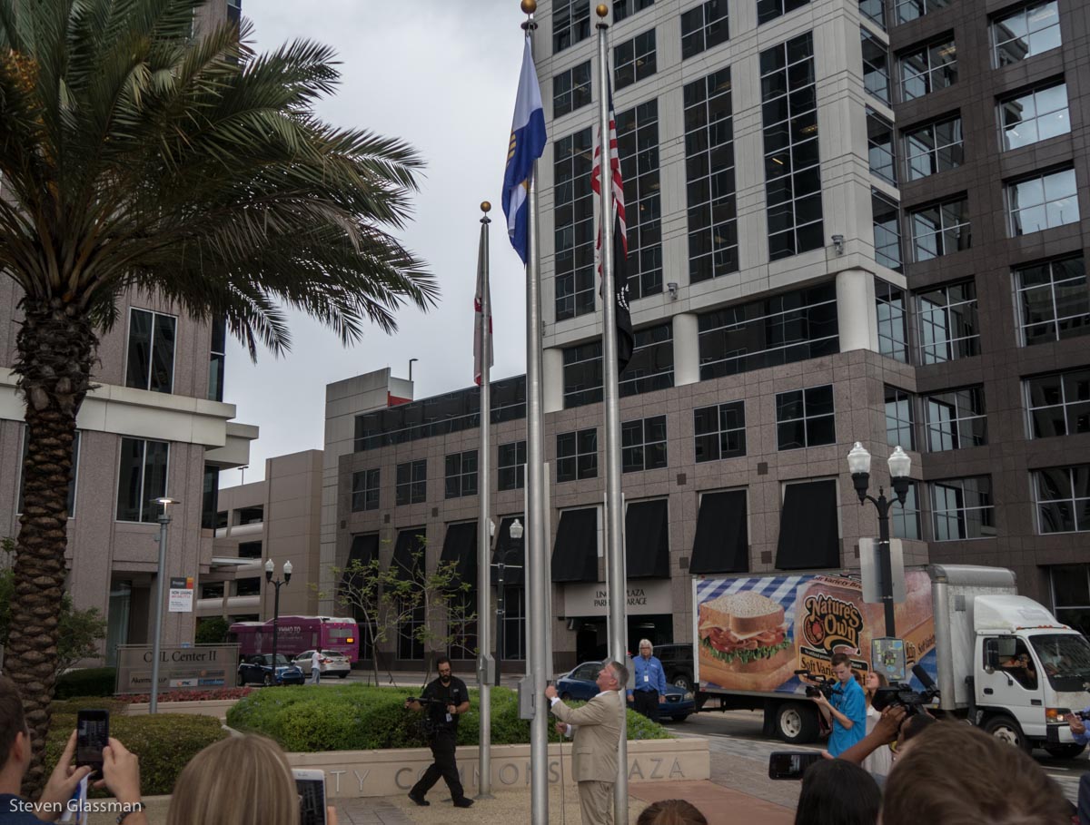 July 31st, 2017 is Orlando’s 142nd birthday. To celebrate the birthday, there was a celebration today at City Hall. With a big birthday cake. Also, today was the raising of the brand new city flag.