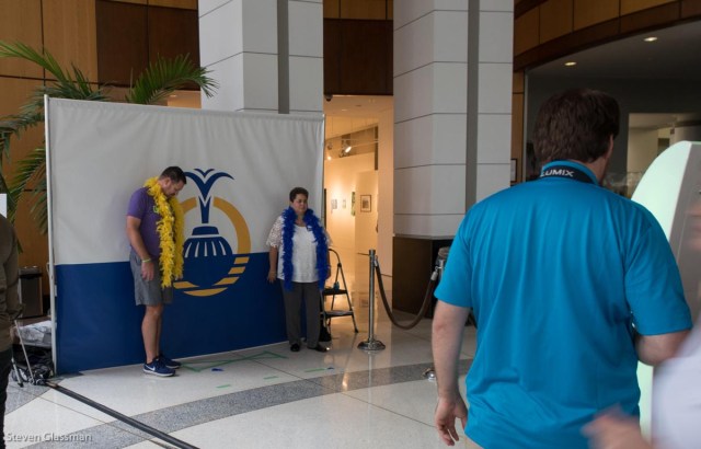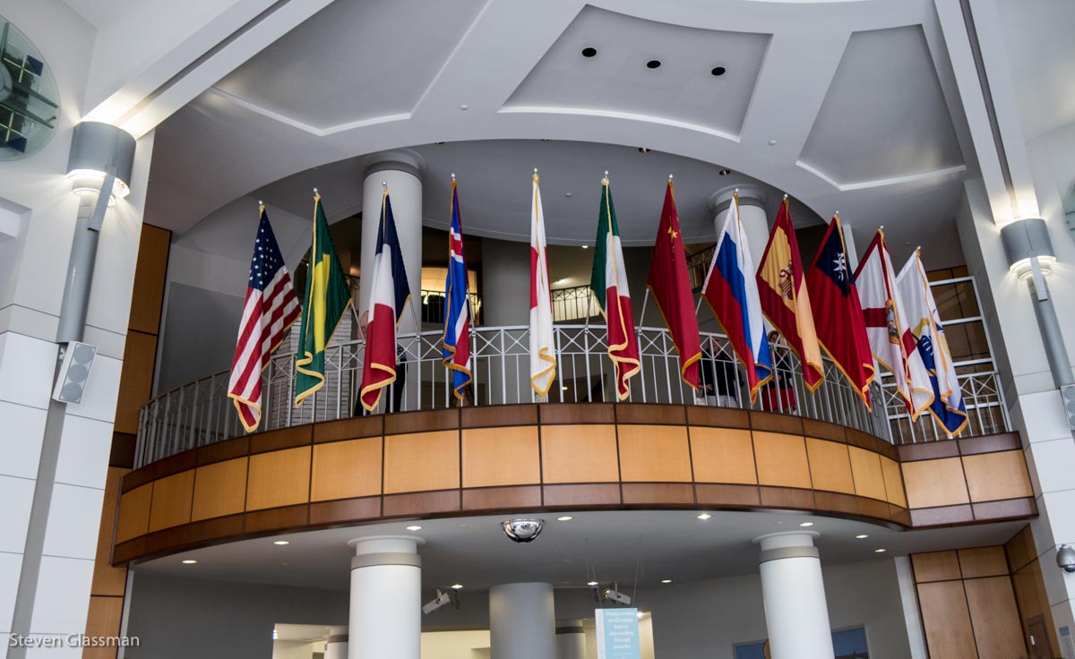 The party was held in the rotunda just inside the main doors, underneath all the flags- the US flag, the Florida flag, and the Orland city flag are all visible. The other nine flags represent the countries of Orlando’s sister cities, I think.