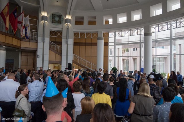 The flag raising was supposed to be outside, but Tropical Storm Emily spun up off the left coast of Florida this morning, and that forced a change. They made the best of it, though, and put a fan behind the flag to make it flap in the “breeze” after it was raised. Incidentally, the man in the beige suit is Mayor Buddy Dyer. I’ve seen him speak a few times now, and he seems like a pretty good guy.