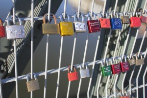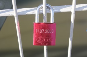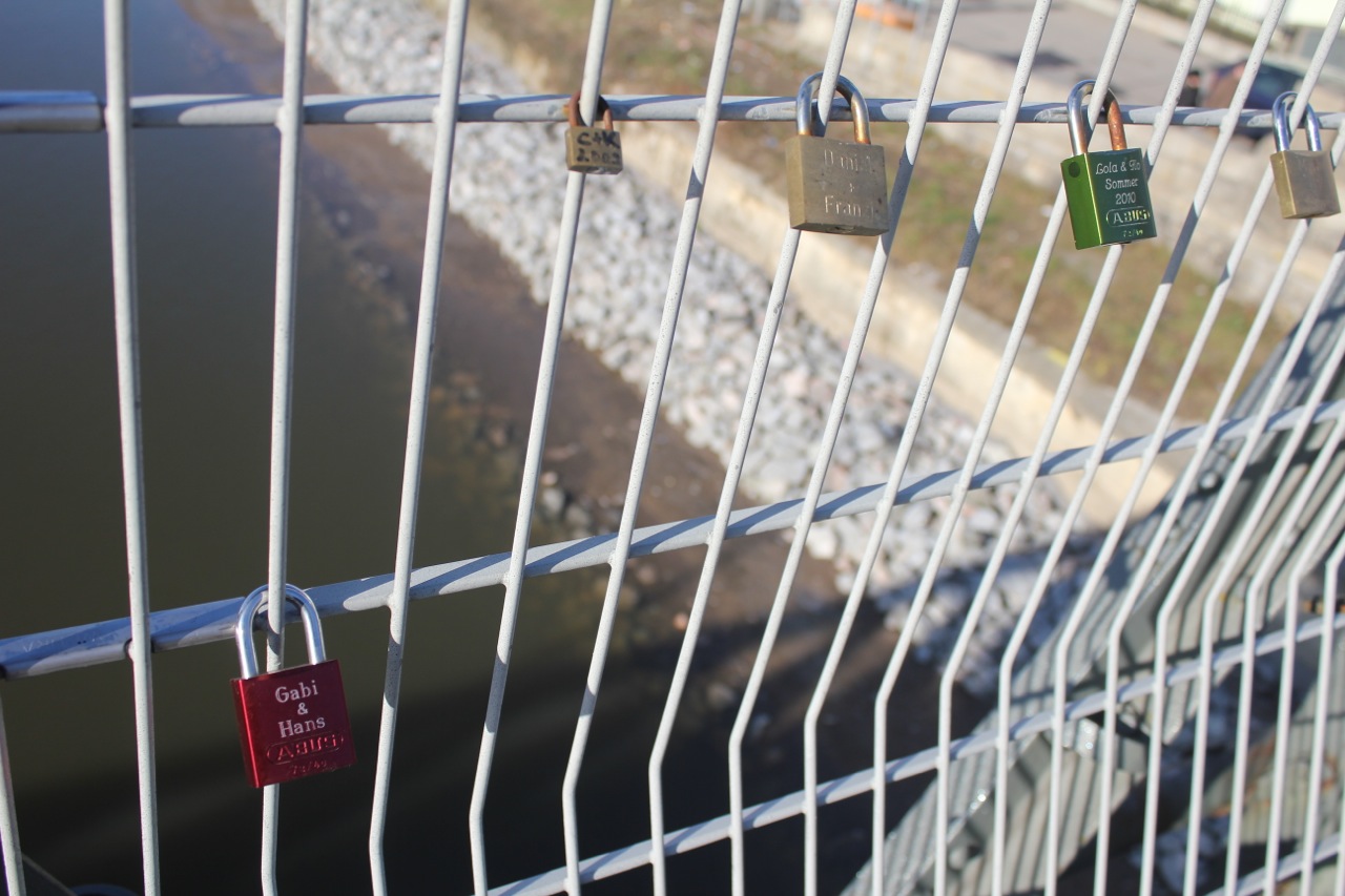 The tradition, which is apparently very common in Germany, is for lovers to inscribe their names on the metal locks, sometimes with a personal message but sometimes not, and then attach the padlock to the bridge while declaring their undying love for each over. Then they kiss and throw the key of the padlock into the river below as a romantic gesture.