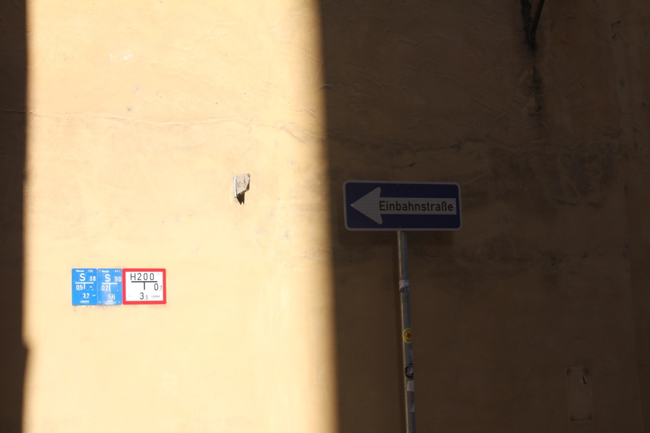 That sign in the shadowed portion of the picture? I’ve seen them all over town, pointing in different directions. I couldn’t figure out what they were pointing to, so I finally asked someone. It turns out they just say “one way street.” Oops!