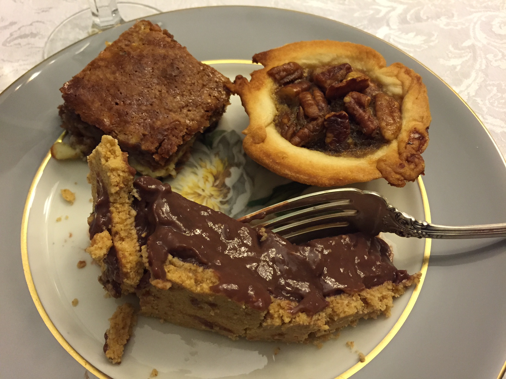 I’ll go for the bonus points here, and also show you my dessert plate. On the top row, there’s a chocolate and cream cheese brownie which is more cream-cheese than chocolate, “twisted and evil.” Next up is a tiny pecan pie. A pie-lette, even. And on the bottom is a slice (and I use that term loosely) of chocolate pudding pie, a family tradition. There was also pumpkin pie, but I can have that almost any time.