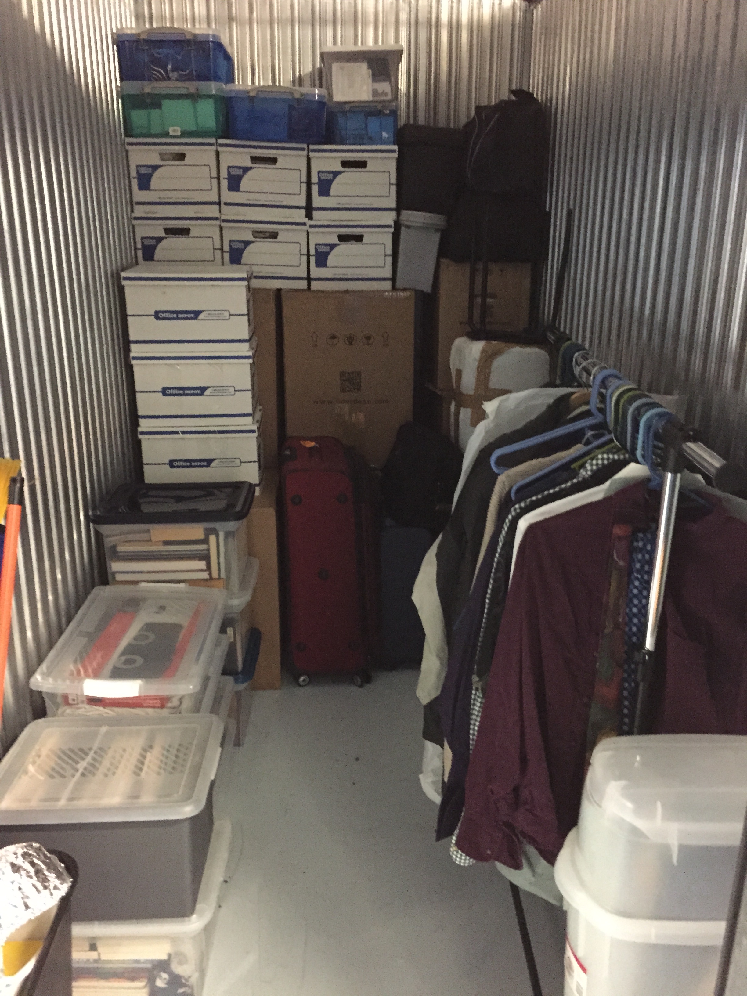 Yesterday, I moved all the stuff I had stashed in my brother’s storage unit into a second storage unit which contained my shipment of stuff from Germany. Once I was done combining all the stuff into one storage unit, I had a good look at what was there. This photograph shows everything I own, save for a small closet’s worth of clothing, my laptop, a coffee table and mirror still at my brother’s house, and my car.