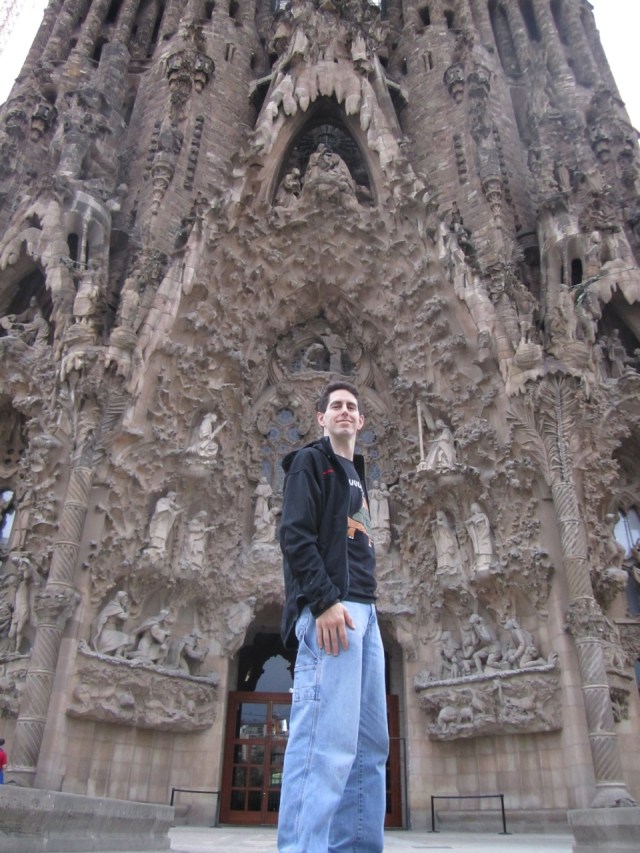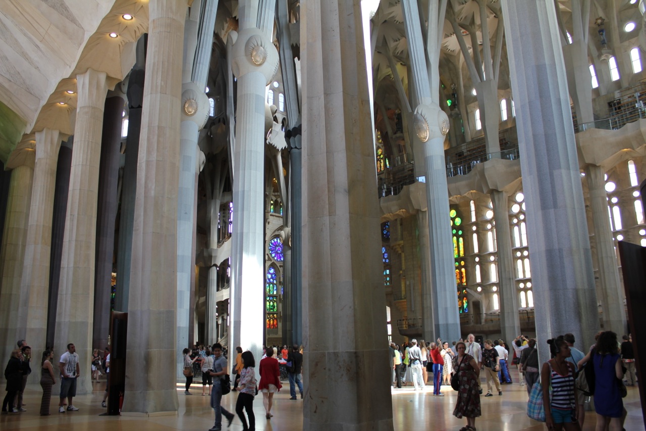 La Sagrada Familia – This enormous church has been under nearly continuous construction since 1882, and it’s expected to be finished sometime around 2028 using Gaudí’s original plans. One side very ornately shows the Nativity and the life of Christ. I’m standing in front of that side of the building in the picture below. The other side is more austere and it shows the Passion, the death of Christ. The columns inside were designed to resemble trees and branches.